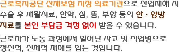 산업재해 후 약해진 운동 기능 및 관절가동범위의 회복을 위한 전문적인 재활치료부터 일상 복귀를 위한 재활 및 요양 프로그램이 진행됩니다.